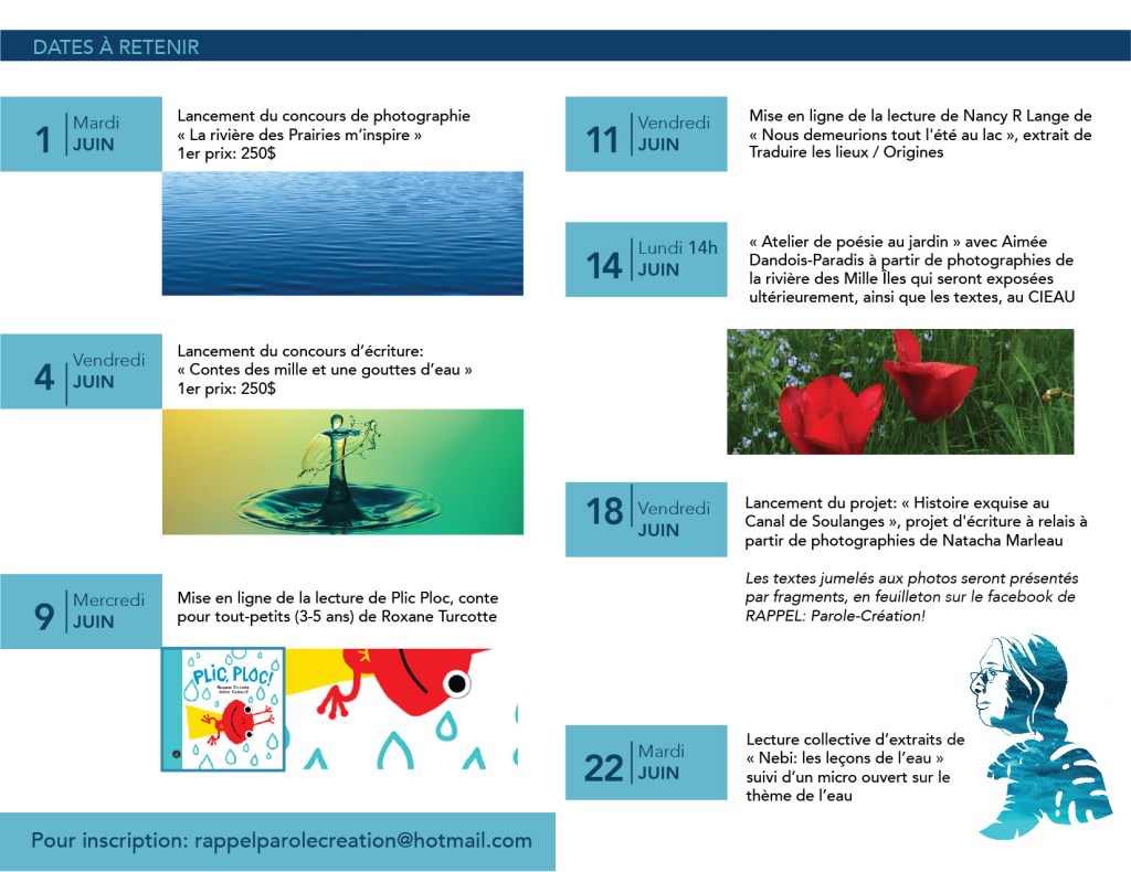 14 juin: « Atelier de poésie au jardin » avec Aimée Dandois-Paradis à partir des onze photos finalistes du concours de photographies de la rivière des Mille Îles. Les textes seront exposés ultérieurement au Centre d’interprétation de l’eau avec les photos.
