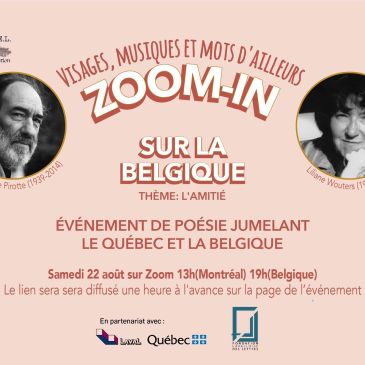 Après avoir visité le Mexique et la Colombie, la série Visage, musiques et mots d’ailleurs nous invite à découvrir la poésie de la Belgique avec Zoom-in sur la Belgique ! Un très bel événement le 22 août à 13h (heure de Montréal) animé par Nancy R Lange et Éric Piette en partenariat avec la Délégation … Lire la suite Zoom-in sur la Belgique: L’amitié