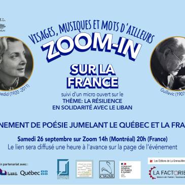 Événement de poésie gratuit se déroulant simultanément en France et au Québec ! Lectures de poètes français qui liront leurs textes et nous présenteront une poète française de jadis et un de ses poèmes. Lectures de poètes et artistes membres de RAPPEL: Parole-Création qui liront un texte sur le thème de la Résilience et un … Lire la suite Zoom-in sur la France