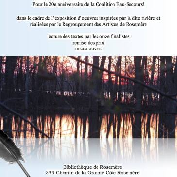 Bonjour à tous! Voici un petit message simplement pour vous annoncer que tous les textes du projet Ambassadeurs de rivière sont maintenant accessibles en ligne! Le projet Ambassadeurs de rivière a été mis sur pied par Nancy R. Lange, auteure, poétesse, présidente de RAPPEL : Parole-Création et représentante des Porteurs d’eau de la Coalition Eau Secours!, … Lire la suite Tous les textes du projet Ambassadeurs de rivière