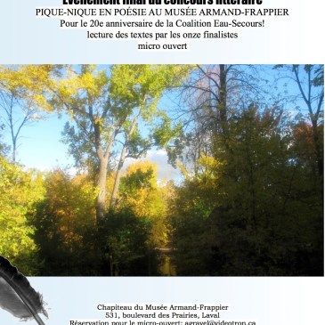 Pour souligner le 20e anniversaire de la Coalition Eau-Secours!, RAPPEL: Parole-Création vous invite à un pique-nique extérieur en poésie, sous le chapiteau, au Musée Armand-Frappier. Un micro-ouvert aura lieu sur les textes du concours La Rivière des Prairies m’inspire. On y entendra aussi les textes des onze finalistes du concours. De plus, le(la) gagnant(e) du … Lire la suite Pique-nique en poésie: finale du concours « La Rivière des Prairies m’inspire »